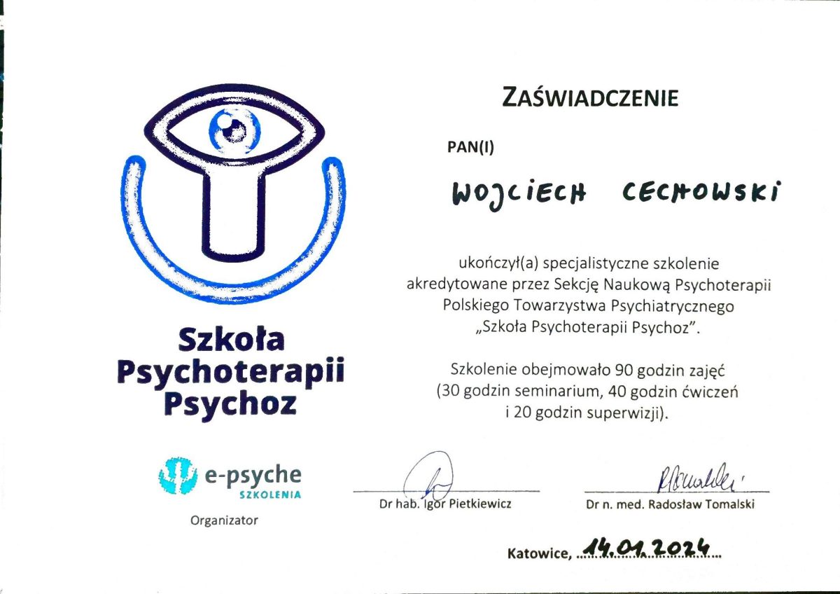 Pracuje pod stałym merytorycznym nadzorem certyfikowanych superwizorów Polskiego Towarzystwa Psychologicznego oraz Polskiego Towarzystwa Psychiatrycznego,