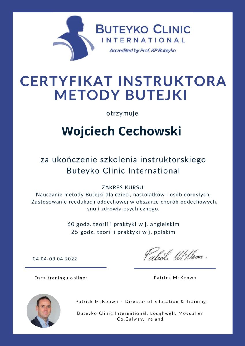 - Kurs instruktorski Metody Butejki – uzyskanie Certyfikatu instruktora metody Butejki, potwierdzającego wiedzę i kompetencje w zakresie prowadzenia treningów oddechowych