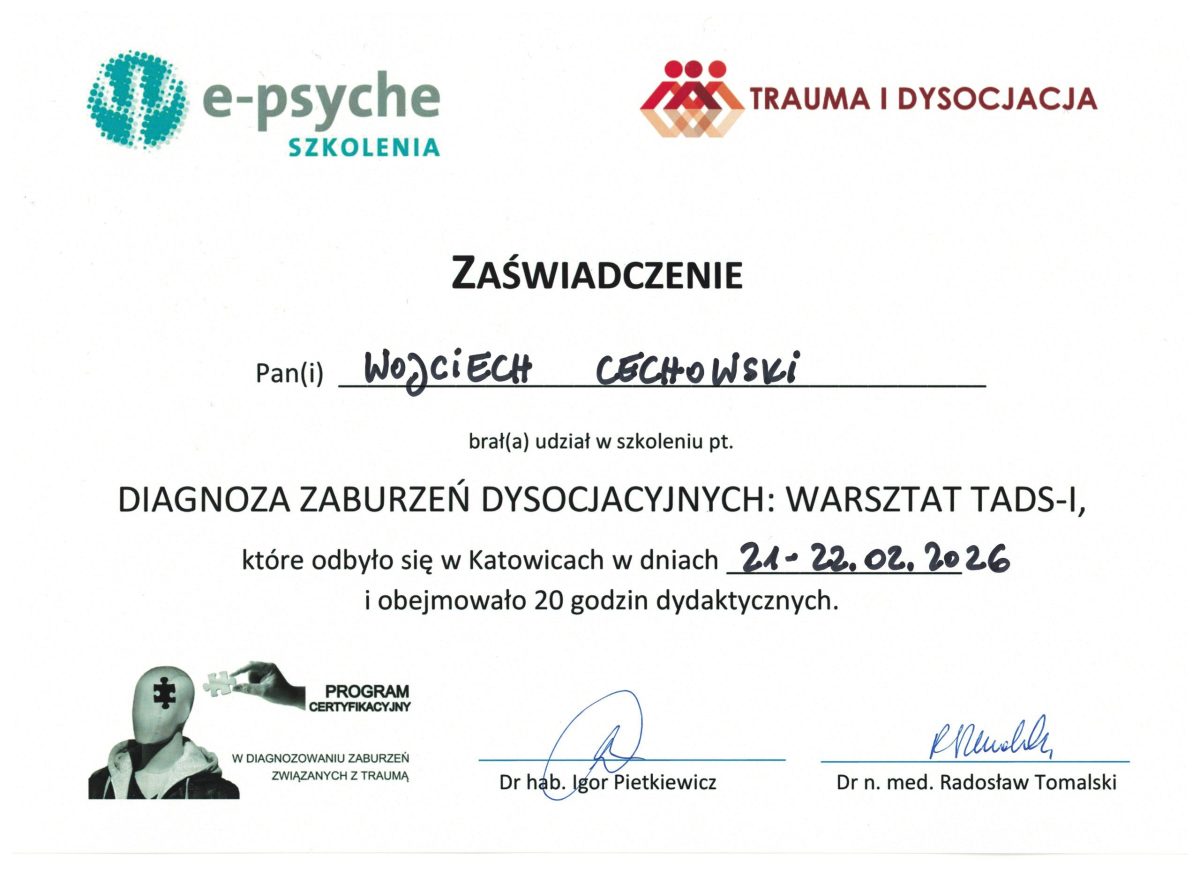 - Szkolenie „Diagnoza zaburzeń dysocjacyjnych: warsztat TADS-I,