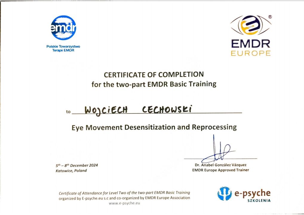 - Pełne podstawowe szkolenie terapii EMDR (stopień I i II),