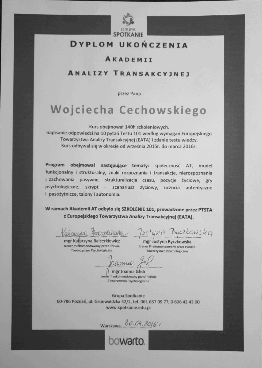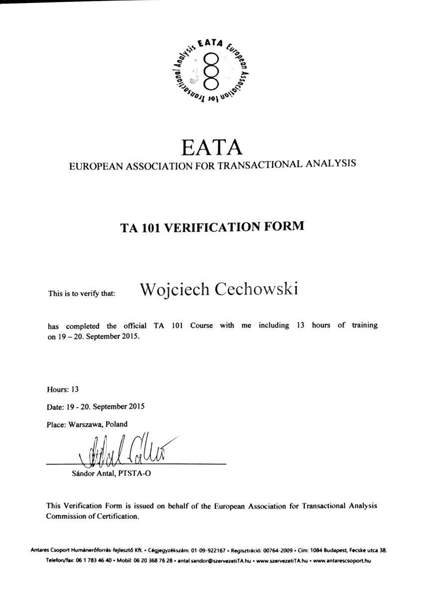 - Półroczne szkolenie w ramach Akademii Analizy Transakcyjnej w Warszawie – Certyfikat 101,