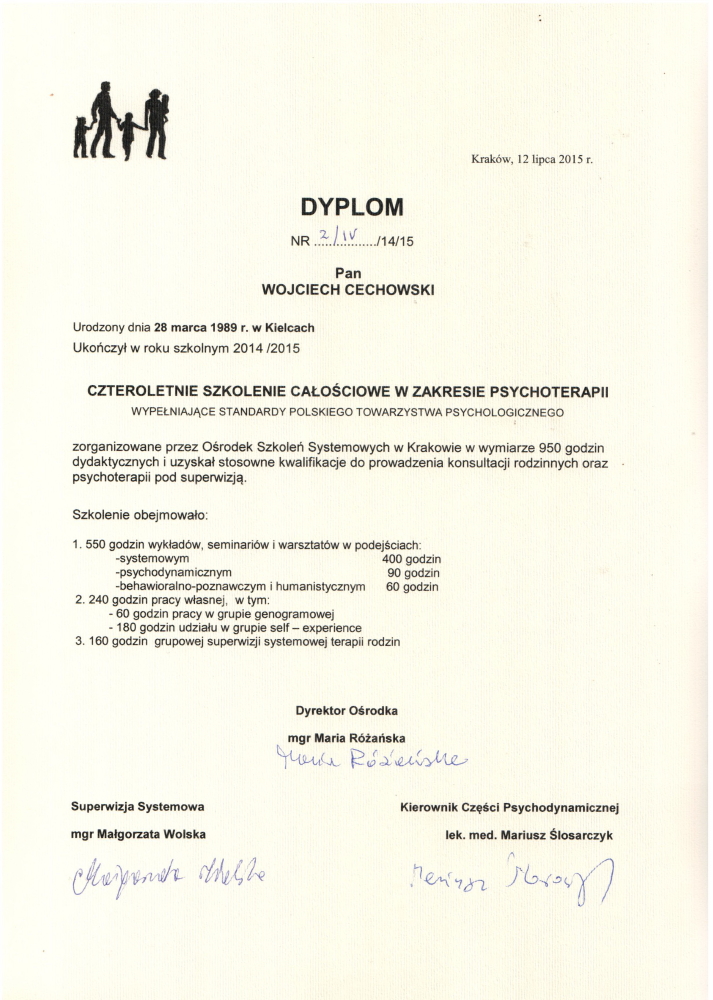 Ukończyłem szereg kursów i szkoleń zawodowych. Dzięki temu posiadam wszelkie niezbędne kwalifikacje do prowadzenia indywidualnej psychoterapii osób dorosłych oraz terapii par i rodzin m.in.: