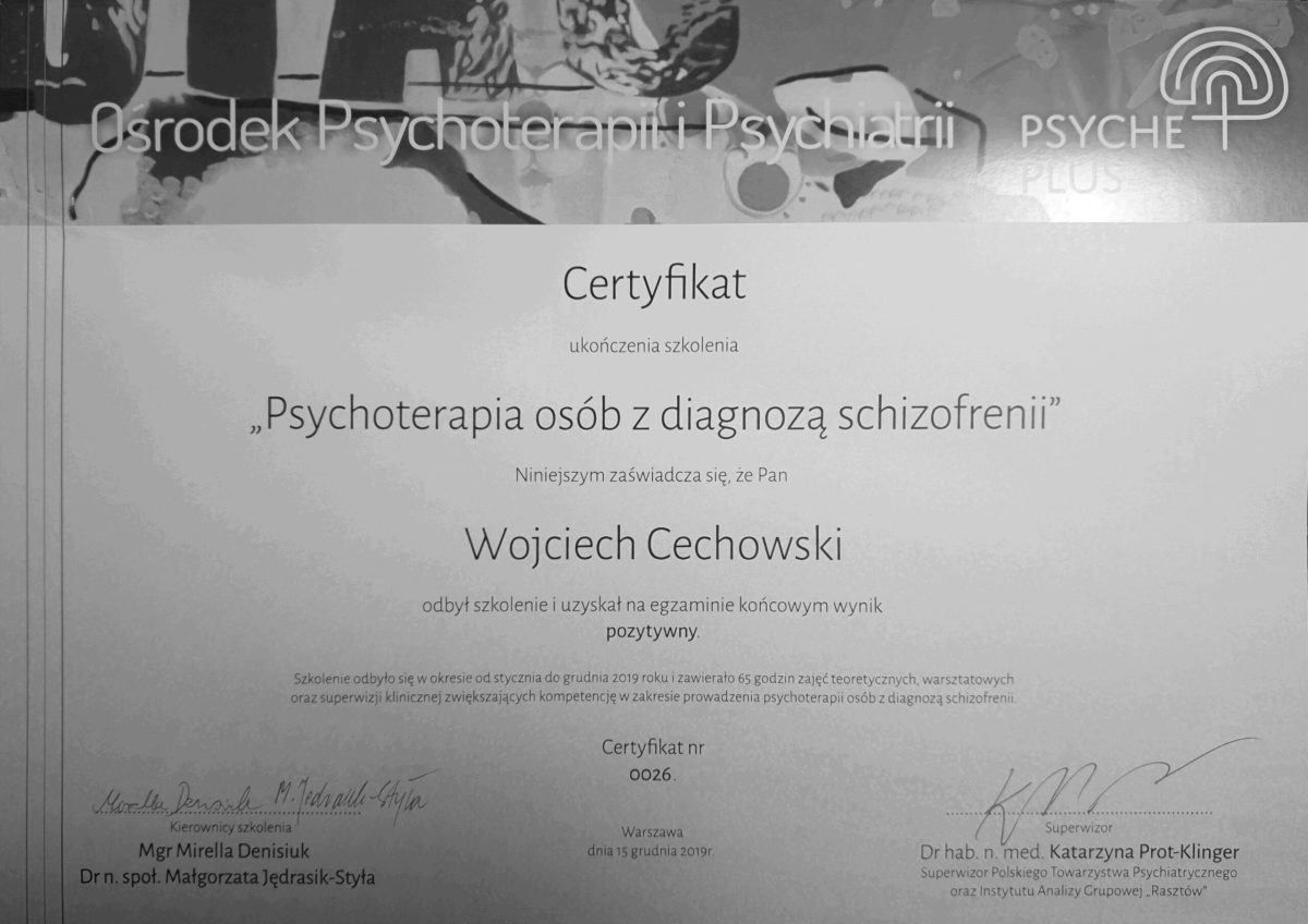 - Roczne szkolenie „Psychoterapia osób z diagnozą schizofrenii” w Warszawie,